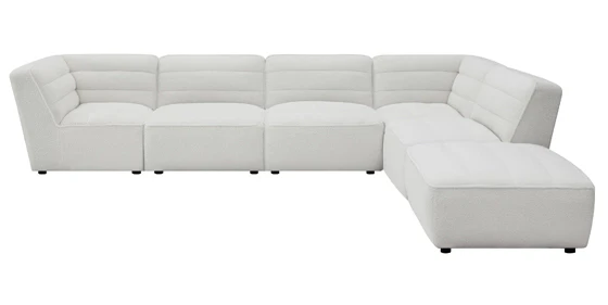 This 6-piece contemporary modular sectional by Coaster includes 3 armless chairs, 2 corners, and an ottoman, channel-tufted backrests, and a natural faux sheep skin upholstery. Its light hue pairs with many color palettes, inviting occupants to recline with ease. For versatility, the ottoman can be used as a coffee table, with a tray of snacks and beverages placed atop. Finishing the look is a set of petite round feet in bold black.