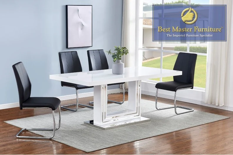 A modern sleek lacquer dining table that will compliment any room. In addition to unique faux leather chairs available in white, black or grey which will make any room look amazing.